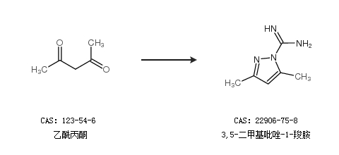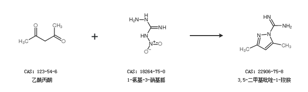 2.通過乙酰丙酮和1-氨基-3-硝基胍合成3,5-二甲基吡唑-1-羧胺
