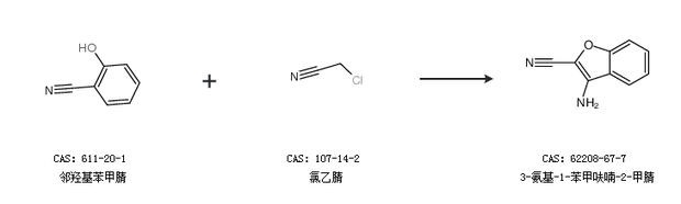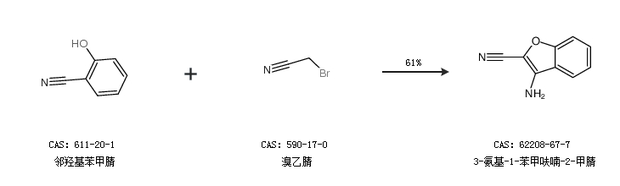 2.通過鄰羥基苯甲腈和溴乙腈合成3-氨基-1-苯甲呋喃-2-甲腈,收率約61%;