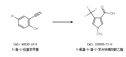 2.通過5-溴-2-羥基苯甲腈合成3-氨基-5-溴-2-苯并呋喃羧酸乙酯