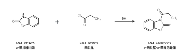 1.通過2-苯并唑啉酮和丙酰氯合成3-丙?;?2-苯并惡唑酮,收率約99%;