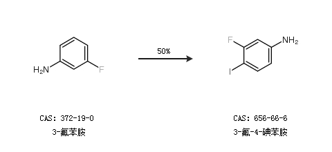 1.通過3-氟苯胺合成3-氟-4-碘苯胺,收率約50%;