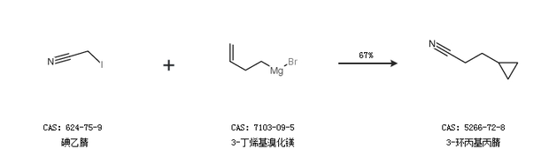 2.通過(guò)碘乙腈和3-丁烯基溴化鎂合成3-環(huán)丙基丙腈,收率約67%;