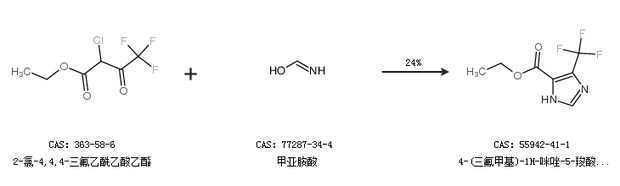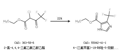 2.通過2-氯-4,4,4-三氟乙酰乙酸乙酯和甲亞胺酸合成4-(三氟甲基)-1H-咪唑-5-羧酸乙酯,收率約24%;