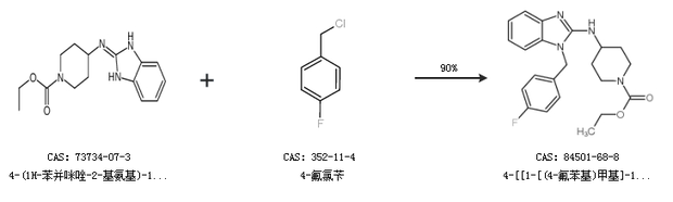 1.通過(guò)4-(1H-苯并咪唑-2-基氨基)-1-哌啶羧酸乙酯和4-氟氯芐合成4-[[1-[(4-氟苯基)甲基]-1H-苯并咪唑-2-基]氨基]哌啶-1-甲酸乙酯,收率約90%;