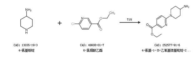 1.通過(guò)4-氨基哌啶和6-氯煙酸乙酯合成4-氨基-1-(5-乙氧基羰基吡啶-2-基)哌啶,收率約71%;