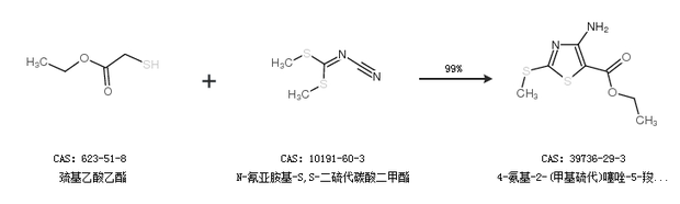1.通過(guò)巰基乙酸乙酯和N-氰亞胺基-S,S-二硫代碳酸二甲酯合成4-氨基-2-(甲基硫代)噻唑-5-羧酸乙酯,收率約99%;