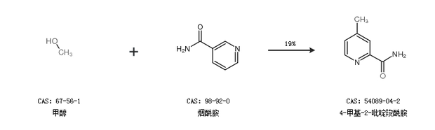1.通過(guò)甲醇和煙酰胺合成4-甲基-2-吡啶羧酰胺,收率約19%;