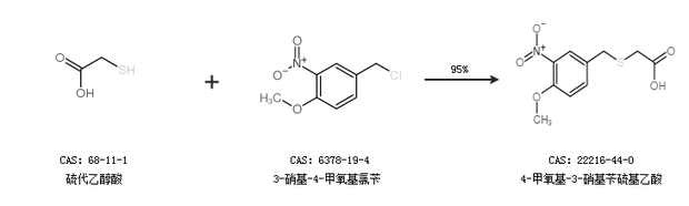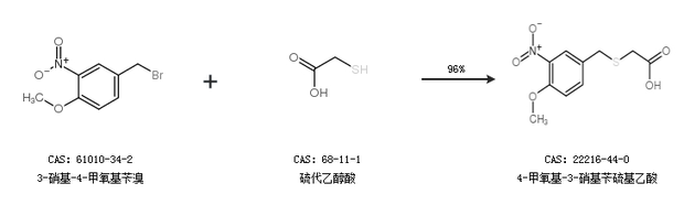 1.通過3-硝基-4-甲氧基芐溴和硫代乙醇酸合成4-甲氧基-3-硝基芐硫基乙酸,收率約96%;