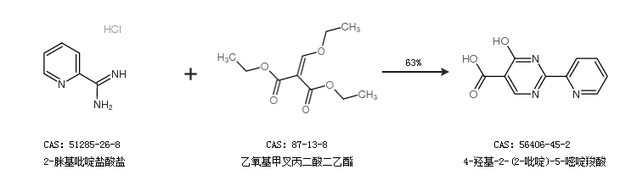 1.通過2-脒基吡啶鹽酸鹽和乙氧基甲叉丙二酸二乙酯合成4-羥基-2-(2-吡啶)-5-嘧啶羧酸,收率約63%;