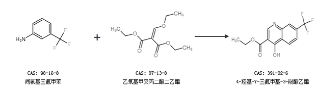 2.通過(guò)間氨基三氟甲苯和乙氧基甲叉丙二酸二乙酯合成4-羥基-7-三氟甲基-3-羧酸乙酯