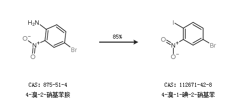 1.通過4-溴-2-硝基苯胺合成4-溴-1-碘-2-硝基苯,收率約85%;