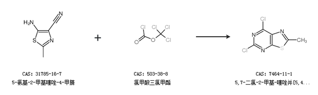 1.通過5-氨基-2-甲基噻唑-4-甲腈和氯甲酸三氯甲酯合成5,7-二氯-2-甲基-噻唑并[5,4-d]嘧啶