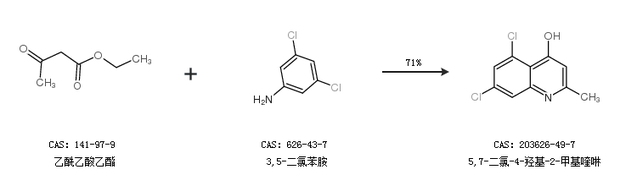1.通過乙酰乙酸乙酯和3,5-二氯苯胺合成5,7-二氯-4-羥基-2-甲基喹啉,收率約71%;