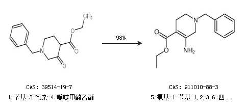1.通過1-芐基-3-氧雜-4-哌啶甲酸乙酯合成5-氨基-1-芐基-1,2,3,6-四氫-吡啶-4-羧酸乙酯,收率約98%;