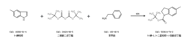 1.通過5-碘吲哚、二碳酸二叔丁酯和苯甲胺合成5-碘-2,3-二氫吲哚-1-羧酸叔丁酯,收率約46%;