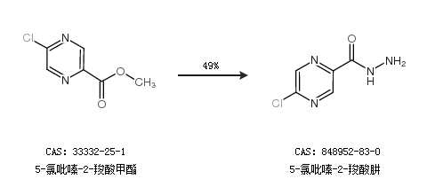 1.通過5-氯吡嗪-2-羧酸甲酯合成5-氯吡嗪-2-羧酸肼,收率約49%;