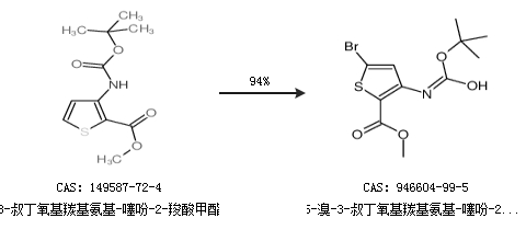 1.通過3-叔丁氧基羰基氨基-噻吩-2-羧酸甲酯合成5-溴-3-叔丁氧基羰基氨基-噻吩-2-羧酸甲酯,收率約94%;
