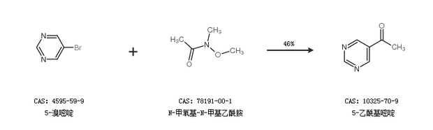 1.通過(guò)5-溴嘧啶和N-甲氧基-N-甲基乙酰胺合成5-乙酰基嘧啶,收率約46%;