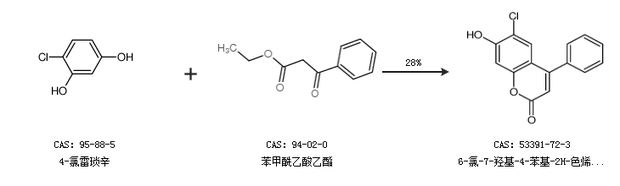 1.通過(guò)4-氯雷瑣辛和苯甲酰乙酸乙酯合成6-氯-7-羥基-4-苯基-2H-色烯-2-酮,收率約28%;