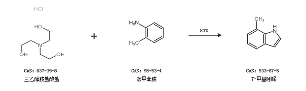 2.通過(guò)三乙醇胺鹽酸鹽和鄰甲苯胺合成7-甲基吲哚,收率約80%;