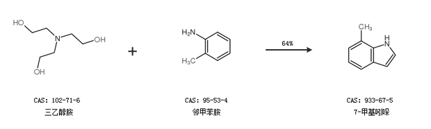 1.通過(guò)三乙醇胺和鄰甲苯胺合成7-甲基吲哚,收率約64%;