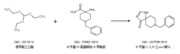 1.通過原甲酸三乙酯和N-芐基-4-氨基哌啶-4-甲酰胺合成8-芐基-1,3,8-三aza-螺[4.5]-1-癸烯-4-酮