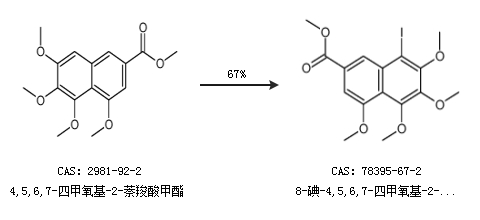 1.通過4,5,6,7-四甲氧基-2-萘羧酸甲酯合成8-碘-4,5,6,7-四甲氧基-2-萘羧酸甲酯,收率約67%;