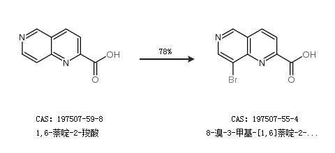1.通過(guò)1,6-萘啶-2-羧酸合成8-溴-3-甲基-[1,6]萘啶-2-羧酸,收率約78%;