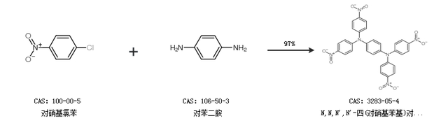 1.通過(guò)對(duì)硝基氯苯和對(duì)苯二胺合成N,N,N'',N''-四(對(duì)硝基苯基)對(duì)苯二胺,收率約97%;
