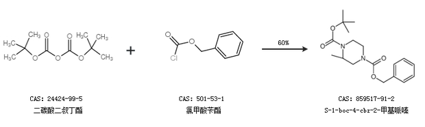 1.通過(guò)二碳酸二叔丁酯和氯甲酸芐酯合成S-1-boc-4-cbz-2-甲基哌嗪,收率約60%;