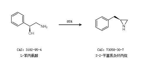1.通過L-苯丙氨醇合成S-2-芐基氮雜環(huán)丙烷,收率約85%;