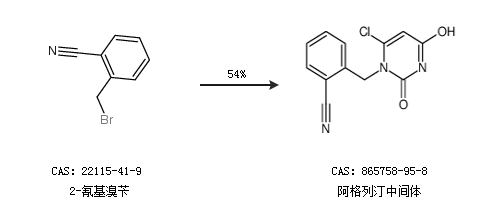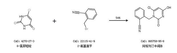 1.通過6-氯尿嘧啶和2-氰基溴芐合成阿格列汀中間體,收率約54%;