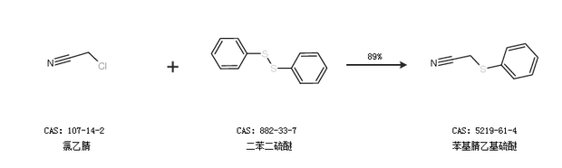2.通過(guò)氯乙腈和二苯二硫醚合成苯基腈乙基硫醚,收率約89%;
