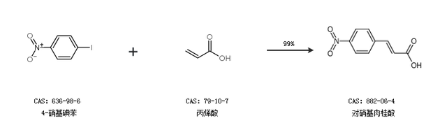 1.通過4-硝基碘苯和丙烯酸合成對硝基肉桂酸,收率約99%;