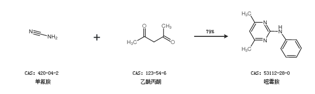 1.通過單氰胺和乙酰丙酮合成嘧霉胺,收率約79%;