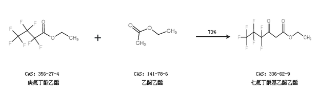 1.通過(guò)庚氟丁酸乙酯和乙酸乙酯合成七氟丁酰基乙酸乙酯,收率約73%;
