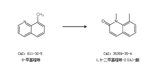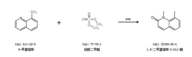 1.通過(guò)8-甲基喹啉和硫酸二甲酯合成1,8-二甲基喹啉-2(1h)-酮,收率約84%;