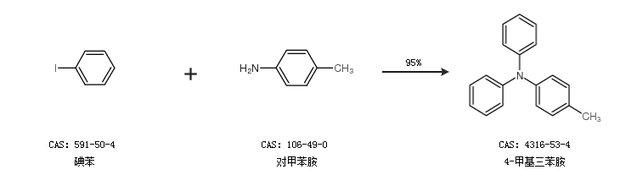 2.通過(guò)碘苯和對(duì)甲苯胺合成4-甲基三苯胺,收率約95%;