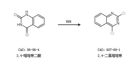 1.通過2,4-喹唑啉二酮合成2,4-二氯喹唑啉,收率約99%;