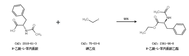 1.通過N-乙酰-L-苯丙氨酸和碘乙烷合成N-乙酰-L-苯丙氨酸乙酯,收率約98%;