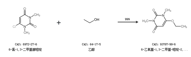 1.通過6-氯-1,3-二甲基脲嘧啶和乙醇合成6-乙氧基-1,3-二甲基-嘧啶-2,4-二酮,收率約99%;