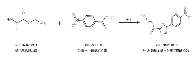 1.通過硫代草氨酸乙酯和2-溴-4''-硝基苯乙酮合成4-(4-硝基苯基)-2-噻唑羧酸乙酯,收率約94%;