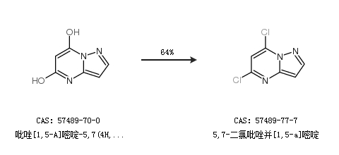 1.通過(guò)吡唑[1,5-A]嘧啶-5,7(4H,6H)-二酮合成5,7-二氯吡唑并[1,5-a]嘧啶,收率約64%;