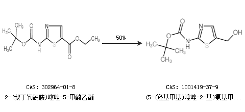 1.通過2-(叔丁氧酰胺)噻唑-5-甲酸乙酯合成(5-(羥基甲基)噻唑-2-基)氨基甲酸叔丁酯,收率約50%;