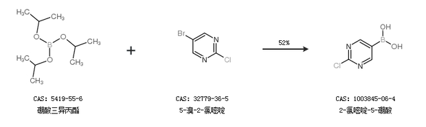 2.通過硼酸三異丙酯和5-溴-2-氯嘧啶合成2-氯嘧啶-5-硼酸,收率約52%;
