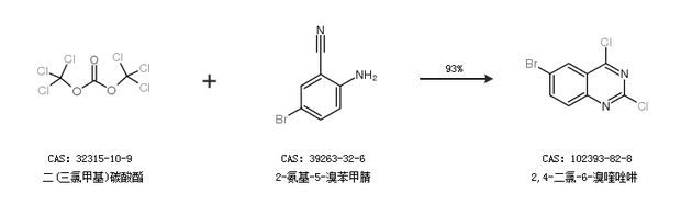 2.通過(guò)二(三氯甲基)碳酸酯和2-氨基-5-溴苯甲腈合成2,4-二氯-6-溴喹唑啉,收率約93%;
