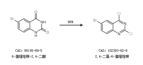 1.通過(guò)6-溴喹唑啉-2,4-二酮合成2,4-二氯-6-溴喹唑啉,收率約98%;