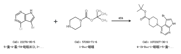 1.通過5-溴-4-氯-7H-吡咯并[2,3-d]嘧啶和1-Boc-哌嗪合成4-(4-Boc-1-哌嗪)-5-溴-7H-吡咯并[2,3-d]嘧啶,收率約45%;