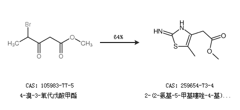 1.通過4-溴-3-氧代戊酸甲酯合成2-(2-氨基-5-甲基噻唑-4-基)乙酸甲酯,收率約64%;