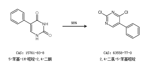 1.通過5-苯基-1H-嘧啶-2,4-二酮合成2,4-二氯-5-苯基嘧啶,收率約98%;